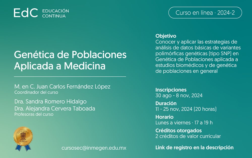 Curso a distancia “Genética de Poblaciones Aplicada a Medicina” organizado por el Instituto Nacional de Medicina Genómica de México. Se inicia el 11 de noviembre de 2024, la inscripción cierra el día 8 de noviembre.